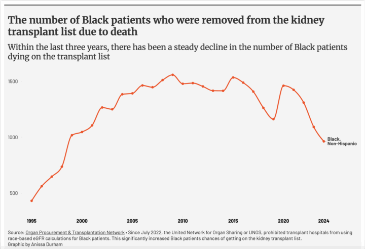As of publication, no database tracks the number of Black patients who died before getting on the kidney transplant waitlist — or died while waiting on the list — because of the race-based eGFR correction.